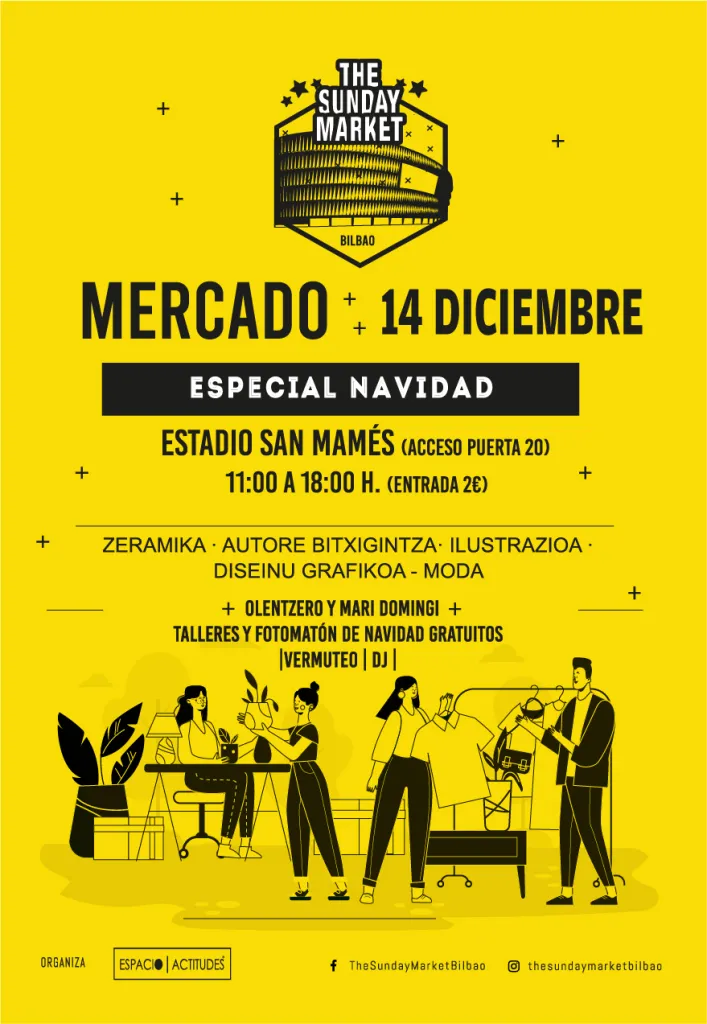Por tercer año, The Sunday Market vuelve al estadio de San Mamés por Navidad. Este 2025 la cita será el domingo 14 de diciembre, de 11:00h a 18:00 horas, con 40 expositores de moda, complementos, diseño, decoración, arte, belleza, bisutería u objetos vintage, más talleres, fotomatón, Olentzero y Mari Domingi… ¡además de música a cargo de Alma Botxera DJ!